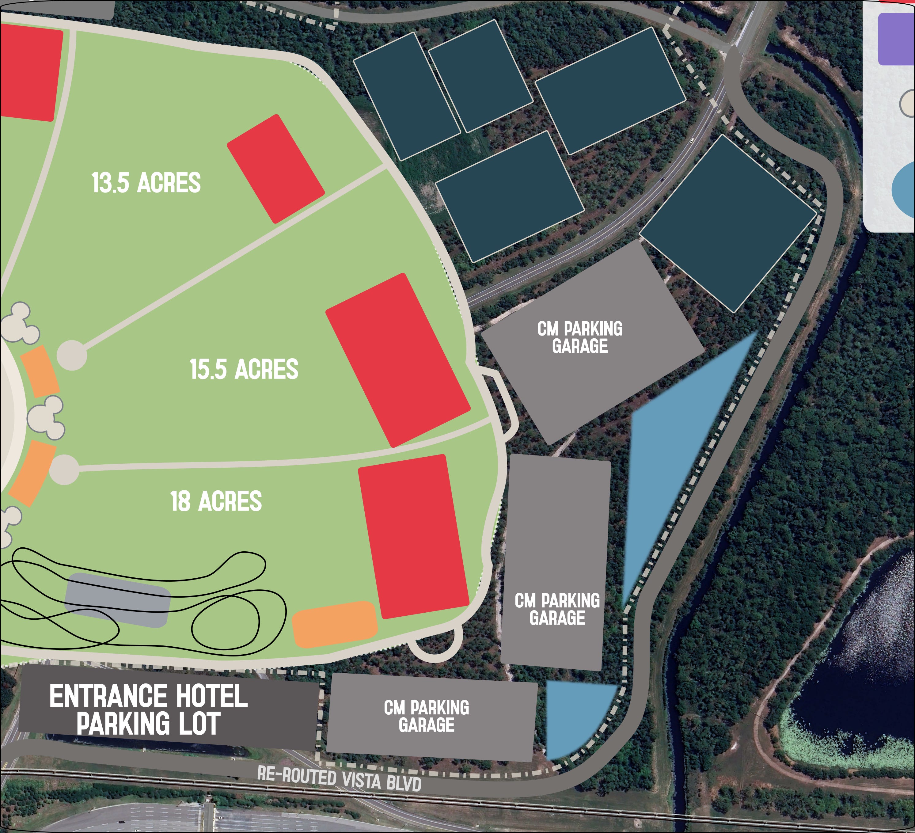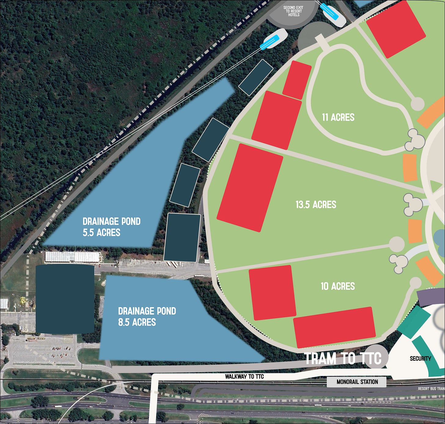 The only thing I feel goes against this parcel is although it somewhat balances the north south divide of parks, it does nothing to connect the dots between existing parks as it is located further west of MK. Also some of this 300 acre parcel is already being utilised for drainage ponds for Rivers of America removal, so there may be logistical problems with sharing a drainage basin and infrastructure we are not fully seeing yet.