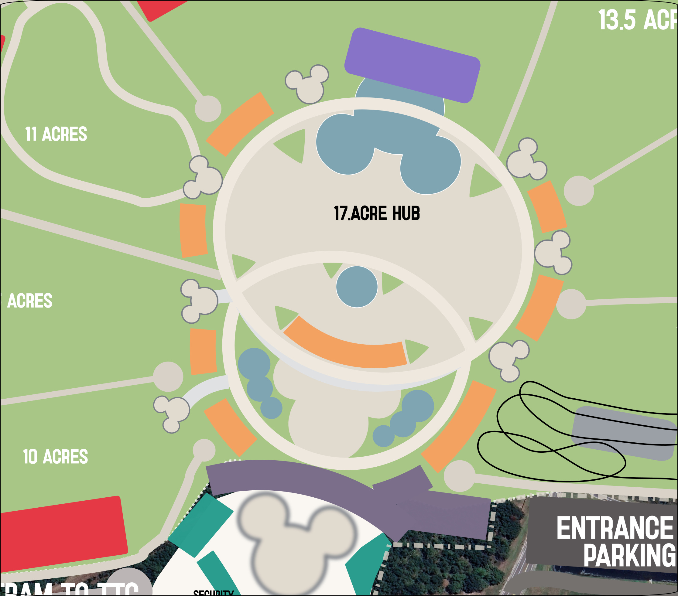 My design retains the principle of the Hub and Spoke design, but in this design we increase the “axle” size to reduce bottle necks. This area is approximately 22 acres, with around 6 acres as a dedicated standing room, for shows.