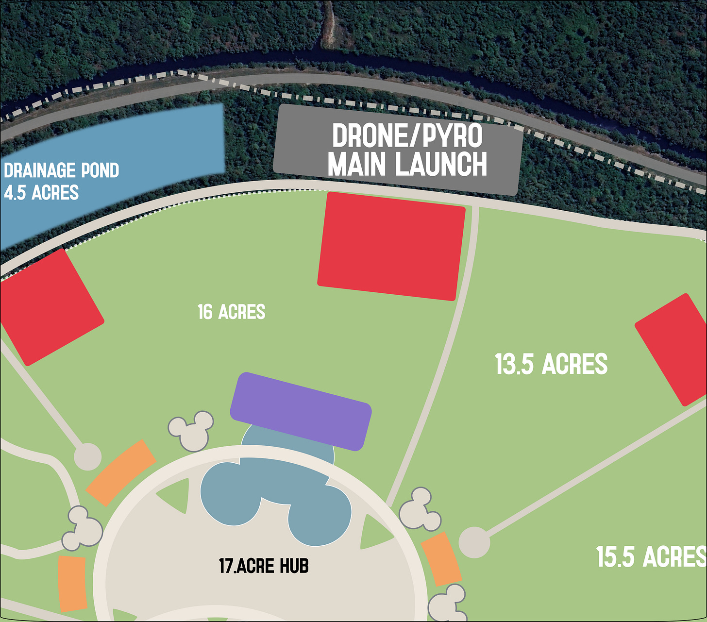With this design, I have allocated a 3.5 acre area directly behind the weenie to serve as a drone take off point, which essentially has its own air space, for separation from fire work launches. There is room for smaller pyro launch sites outside the ring road, to further build on Magic Kingdom’s perimeter fireworks shows.