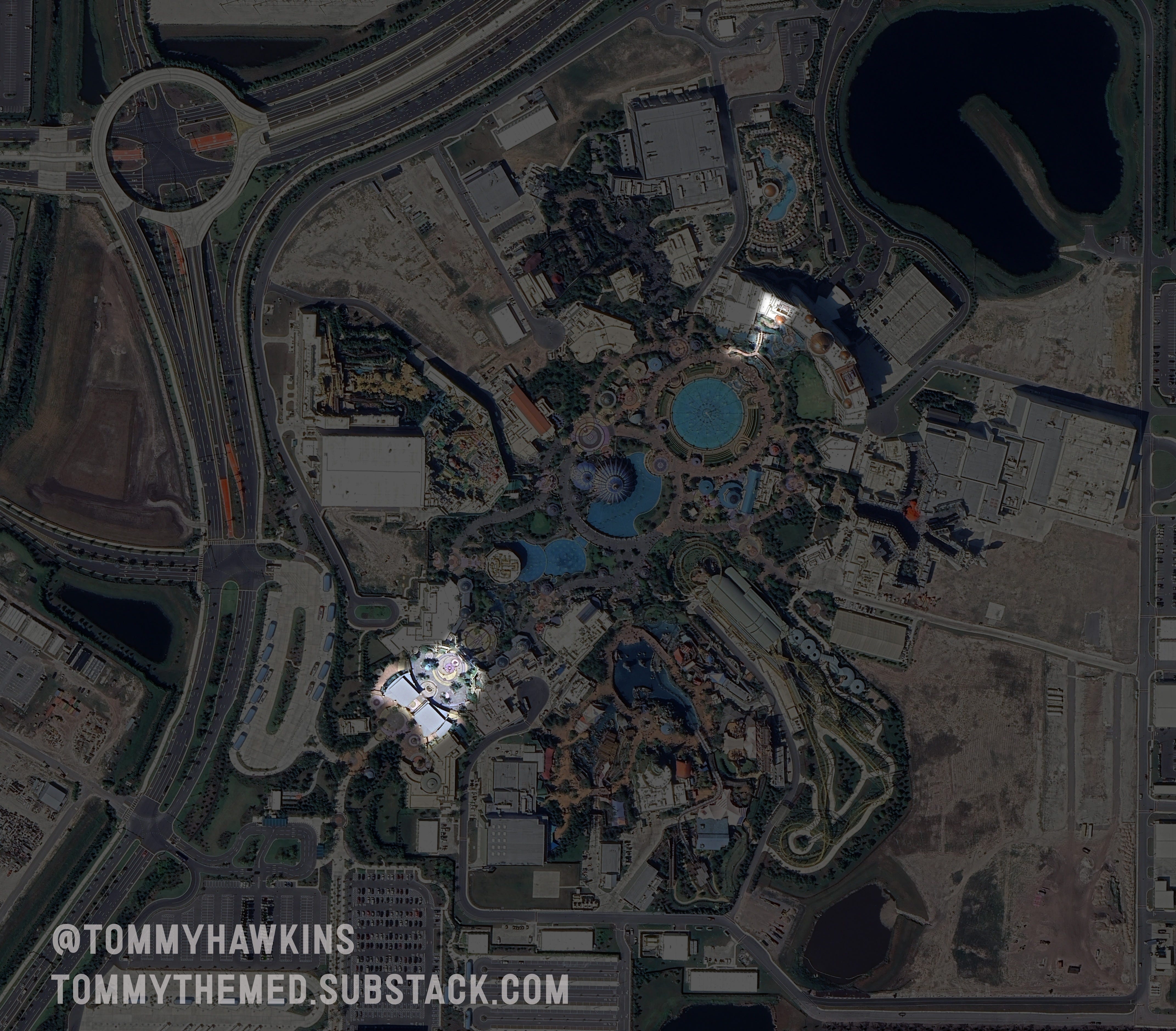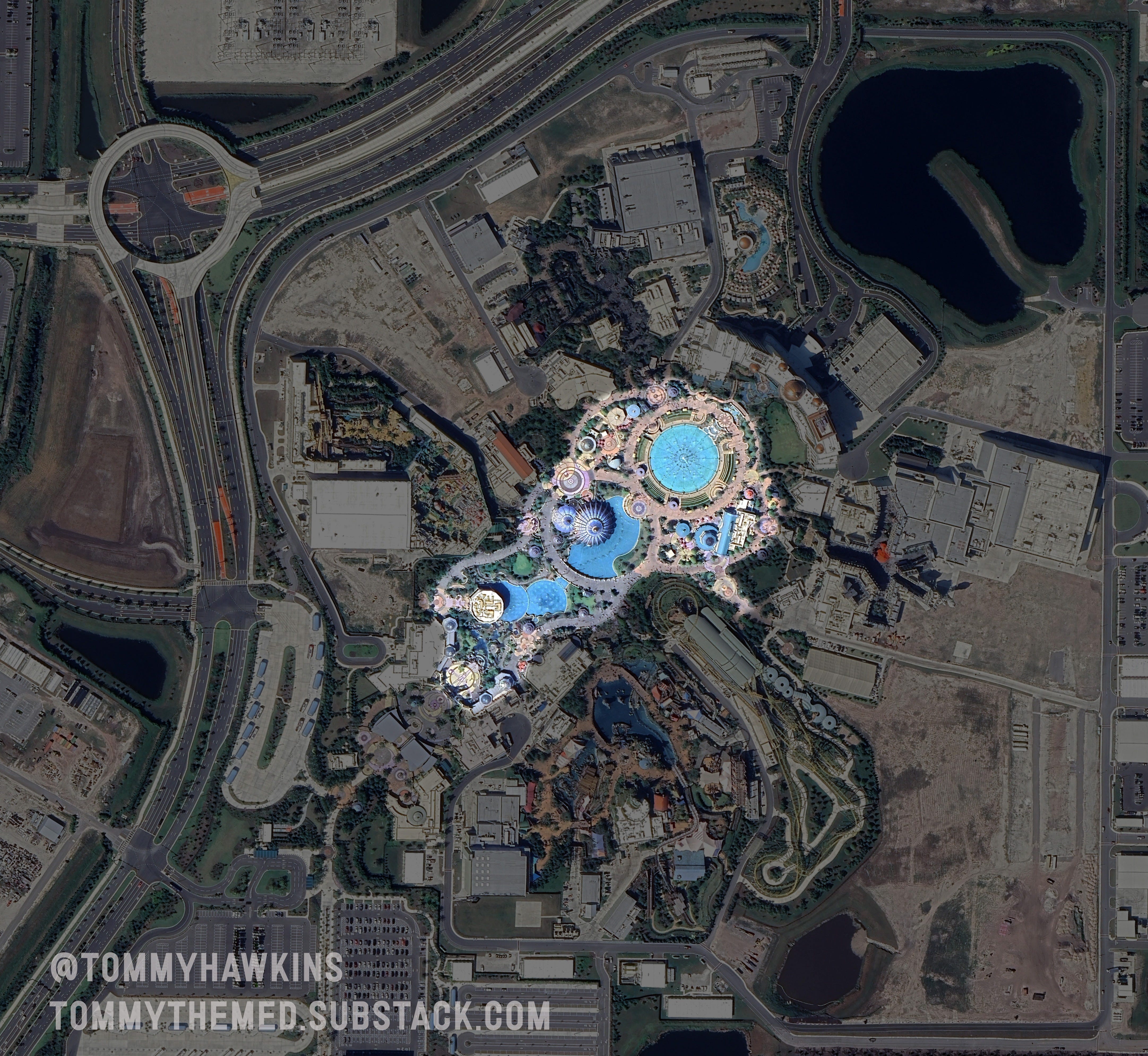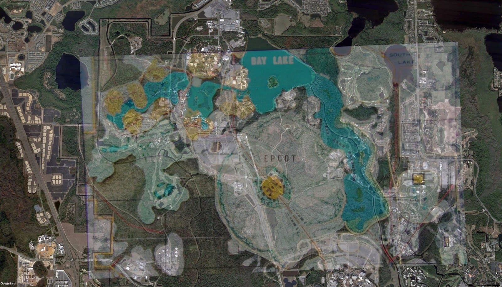 There’s more, this site has always been good for something. An aerial photo by Bioreconstruct reminded me that I did an overlay several years ago placing the original 1967 master plan of the E.P.C.O.T onto modern day Disney World . This parcel sits where the original EPCOT was intended to be built.