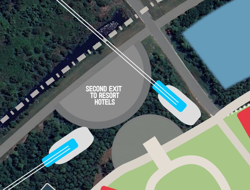 Additionally I designed a walking and tram route back to the TTC parking lot. Perhaps the TTC could be upgraded with multi-storey parking to increase capacity. I also found room for bus stops near the monorail station that could serve Resort hotels. This could also be a skyliner station.